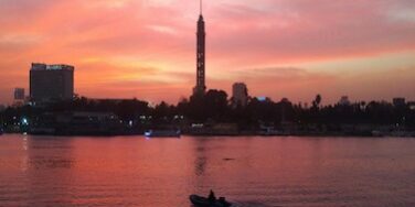 We take a boat ride down the Nile enjoying an evening cruise with dinner and a show of traditional music and dance as we cruise alongside the glittering lights of Cairo.